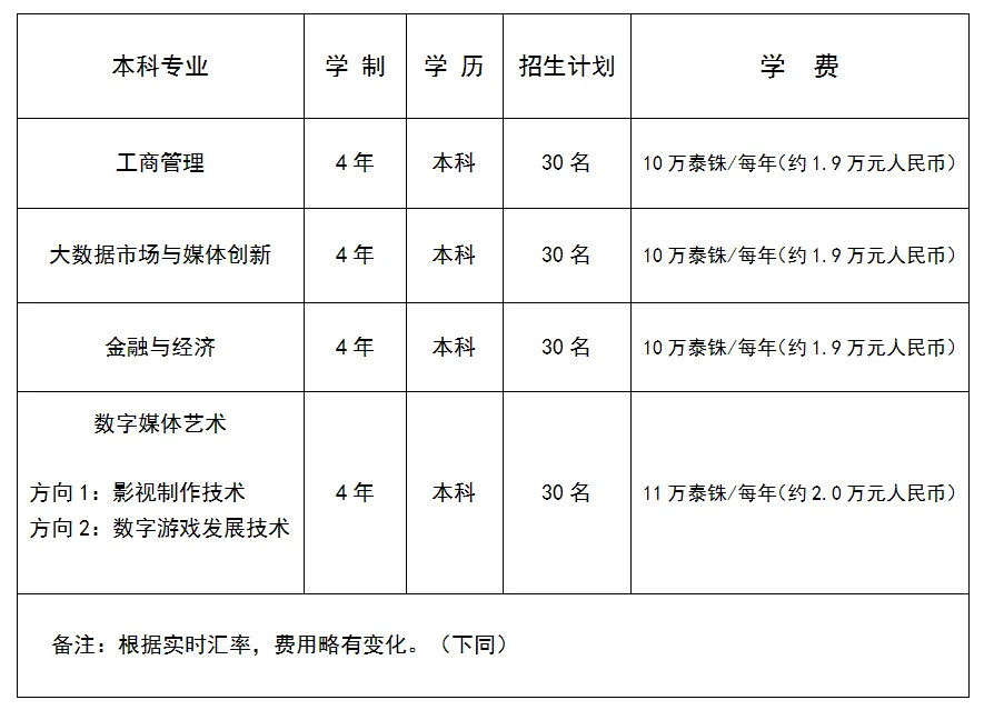 學(xué)制與學(xué)位:學(xué)制四年,畢業(yè)后由泰國坦亞武里皇家理工大學(xué)頒發(fā)學(xué)士學(xué)位。