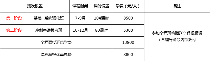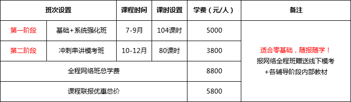 基礎(chǔ)班:循序漸進(jìn),理清各科考點(diǎn);夯實(shí)基礎(chǔ),做到溫故知新; 穩(wěn)扎穩(wěn)打,構(gòu)建思維模式;透析考點(diǎn),形成學(xué)習(xí)體系。系統(tǒng)班:全面復(fù)習(xí),強(qiáng)化技巧;系統(tǒng)歸納,總結(jié)考點(diǎn);結(jié)合真題,重點(diǎn)突破;運(yùn)用技巧,快速解題。??即v班:突破重點(diǎn)題型,查漏補(bǔ)缺;體驗(yàn)全真考場,調(diào)整心態(tài);分配答題時(shí)間,有的放矢;模擬強(qiáng)化訓(xùn)練,總結(jié)規(guī)律;把握命題規(guī)律,預(yù)測考向考點(diǎn)歸納總結(jié),查漏補(bǔ)缺;預(yù)測命題態(tài)勢,輕松上陣。報(bào)全程面授班:基礎(chǔ)班+系統(tǒng)強(qiáng)化班+沖刺串講??及?13800元/生。現(xiàn)報(bào)班享特大優(yōu)惠價(jià)8800元/人(贈(zèng)送價(jià)值5800元全程視頻課+各輔導(dǎo)階段內(nèi)部資料)。1、報(bào)全程網(wǎng)絡(luò)班:基礎(chǔ)班+系統(tǒng)強(qiáng)化班+精講模串班=8800元。現(xiàn)報(bào)班享受特大優(yōu)惠價(jià)5800元/人。2、報(bào)網(wǎng)絡(luò)班送:贈(zèng)送???各輔導(dǎo)階段內(nèi)部資料。3、網(wǎng)絡(luò)視頻課針對(duì)沒有時(shí)間參加面授班學(xué)員,手機(jī)、電腦下載APP可自由安排時(shí)間學(xué)習(xí),費(fèi)用低,效率高。