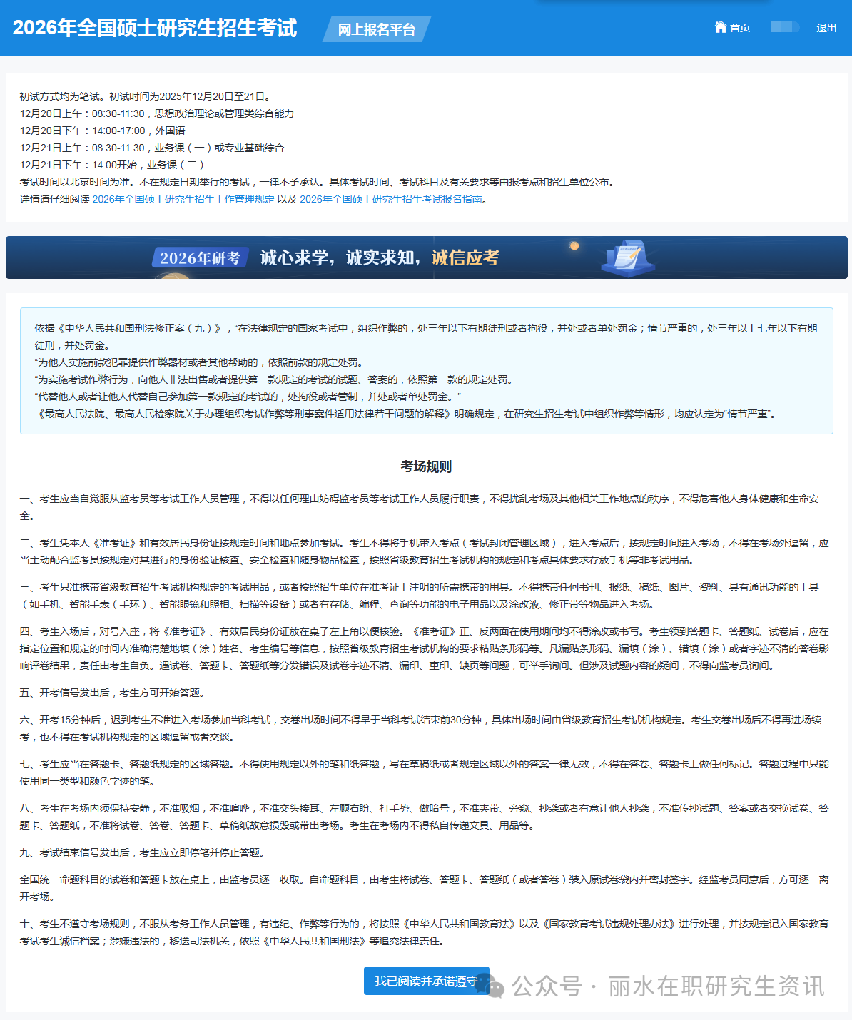 進(jìn)入研招網(wǎng)報(bào)平臺(tái)首頁后,你將看到初試時(shí)間提醒、考場(chǎng)規(guī)則等內(nèi)容,這個(gè)頁面上的提示要認(rèn)真閱讀!