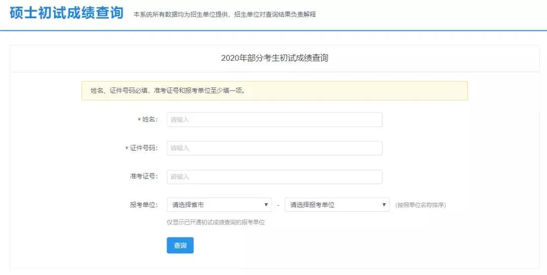 姓名、證件號碼必填,準(zhǔn)考證號和報(bào)考單位至少填一項(xiàng),所以,準(zhǔn)考證丟失的考生也不必?fù)?dān)心,到時(shí)候也可以查到初試的分?jǐn)?shù)。