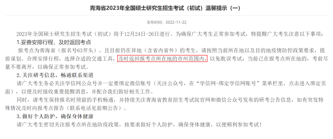 為確保您能順利參加2023年研考,請合理安排時間,盡早返回報考點所在地備考,同時密切關注報考點所在地防疫政策,按要求做好個人防護。